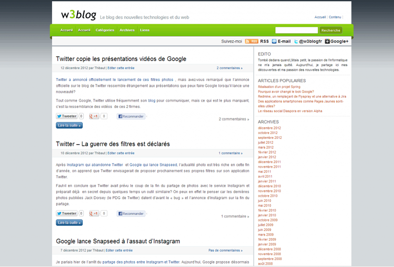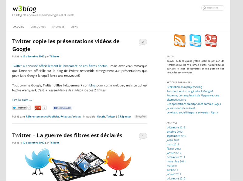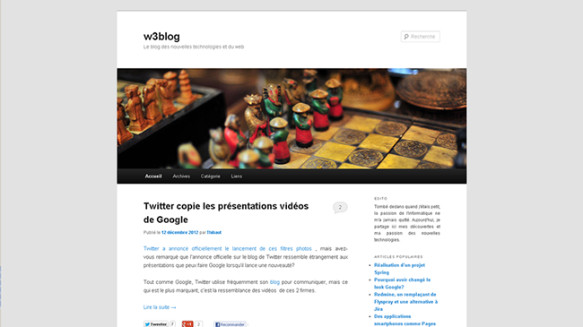 Ce qui est étonnant, c’est qu’une fois avoir réalisé ce travail, wordpress 3.5 est arrivé avec le nouveau template Twenty twelve. Une partie des modifications que j’ai faite sont similaires à celle apporté par l’équipe WordPress, comme quoi, il devait s’agir d’une évolution naturelle et logique du précédent template.